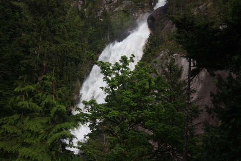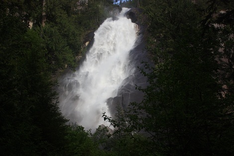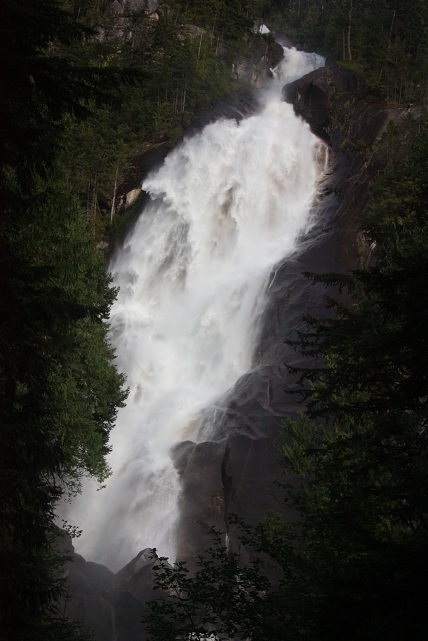 从Whistler出来已经是下午近6点钟了,回去途中我们还要去一个叫Sharon的瀑布,据说应该在BC省10大之内了,所以我也很想看看比起上周我看到的那个38大到底是怎样一个对比。果然,还没看见瀑布就听见了巨大的水声,见到后更惊叹它的壮观,不是很宽,但绝对够高,喷泻的雪水呼啸而下,气势磅礴,站在很远的观景台上也感觉到飞溅过来的水。