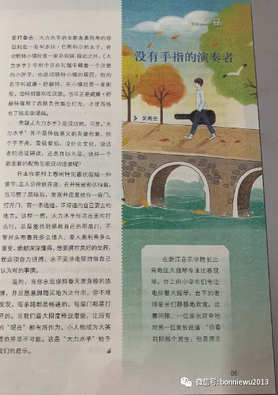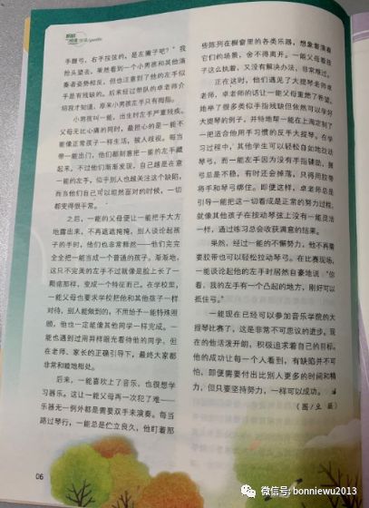 没有手指的演奏者 吴燕云 在浙江音乐学院长三角地区大提琴专业比赛现场,台上的小学生们专注地拉着大提琴,台下的老师家长们静静地欣赏。比赛间隙,一位家长好奇地对另一位家长说道:“你看前排那个男生,他是用左手握弓,右手按弦的,是左撇子吧。”我抬头望去,果然看到一个小男孩和其他演奏者的姿势相反,但也注意到了他的左手似乎是有残缺的。后来经过带队的卓老师介绍后才知道,原来小男孩左手只有拇指。 小男孩叫一能,出生时左手严重残疾,父母无比心痛的同时,最担心的一能不能像正常孩子一样生活、被人歧视。每当带一能出门,他们都刻意把一能的左手藏起来。不过他们渐渐发现,自己越是在意一能的左手,似乎别人也越关注这个缺陷,而当他们自己可以坦然面对的时候,一切都变得很平常。 之后,一能父母便让一能把手大方地露出来,不再遮遮掩掩,别人谈论起孩子的手时,他们也非常释然——他们完完全全把一能当成一个普通的孩子。渐渐地,这只不完美的左手不过就像是脸上长了一颗痣那样,变成一个特征而已。在学校里,一能父母也要求学校把他和其他孩子一样对待,别人能做到的,不用给予一能特殊照顾,他也一定能像其他同学一样完成。一能也遇到过用异样的眼光看待他的同学,在老师、家长的正确引导下,最终大家都非常和睦地相处。 后来,一能喜欢上了音乐,也很想学习器乐。这让一能父母再一次犯了难,乐器无一例外都是需要双手来演奏。每当路过琴行,一能总是伫立良久,他盯着那些陈列在橱窗里的各类乐器,想象着演奏它们的场景,舍不得离开。一能父母看孩子这么执着,又没有解决办法,非常难过。 正在这时,他们遇见了大提琴老师卓老师,卓老师的话让一能父母重燃了希望。她举了很多类似手指残缺但依然可以学好大提琴的例子,并特地帮一能在上海定制了一把适合他用手习惯的反手大提琴。在学习过程中,其他学生可以轻松自如的拉动琴弓,而一能左手因为没有手指辅助,握弓总是不稳,有时还会掉落,只得用胶带将手和琴弓绑住。即便这样,卓老师总是引导一能把这一切看成是正常的努力过程,就像其他孩子在按动琴弦上没有一能灵活一样,通过练习总会达到满意的结果。 果然,经过一能的不懈努力,他不再需要胶带也可以轻松拉动琴弓。在比赛现场,一能谈论起他的左手时居然自豪地说:“你看,我的左手有一个凸起的地方,刚好可以抵住弓。” 一能现在已经可以参加音乐学院的大提琴比赛了,这是非常不可思议的进步。现在的他活泼开朗,积极追求着自己的目标。他的成功让每一个人看到,有缺陷并不可怕,即便需要付出比别人更多的时间和精力,但只要坚持努力,一样可以成功。 作者:吴燕云-英文名Bonnie,自我管理与个人成长教练;AACTP注册讲师;NGH和AAH注册催眠师; 加拿大江苏华人联合总会副会长,南京市侨商会理事,第二届环球华裔太太选美大赛亚军;也是南京市作家协会作家,著有《没那么简单》《再续前缘》《Close To You》《隐匕》等小说,《燕云原创微说》笔记本,《自我管理密码--活成你梦想的样子》课程教材,大量感悟文发表在《特别关注》《青年文摘》《智富时代》《人生与伴侣》《哲思》等名刊大刊。