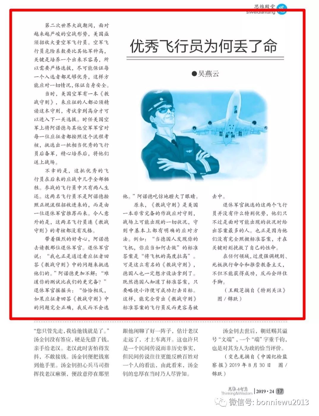 当时美国空军有一本《教战守则》,来应征的人都必须精读这本守则,考试拿到高分才可以进入下一关选拔。时任美国空军上将的阿诺德与其他空军军官对每一位应征者都按照这个流程考核,挑选出一批相当优秀的飞行员后备军,精心培养后,将他们送上战场。 不幸的是,这批优秀的飞行员在后来的应战中几乎全部牺牲。参战的飞行员中只有两人生还。这两名飞行员不是阿诺德按照正规流程招收进来的,而是由一位退休的军官推荐而来。令人意外的是,这两名飞行员连《教战手则》的考核都没有及格。 带着强烈的好奇心,阿诺德去请教那位退休军官。退休军官说:“我也正是通过看应征者回答《教战守则》中的问题来挑选他们的。”阿诺德更加不解:“难道你的测试比我们的更完备?”退休军官摇摇头:“恰恰相反,如果应征者回答《教战守则》中的问题完全正确,我反而不会选他。”阿诺德吃惊地瞪大了眼睛。 原来《教战守则》是美国一本非常完备的作战应对手则,战场上可能出现的一切状况,守则中基本上都有明确的应对方法。例如:“当德国人发现你的飞机,你应当如何去做?”的标准答案是“将飞机的高度拉高”。可是这么有名的《教战守则》,德国人也一定想方设法拿到了,既然德国人知道了标准答案,只要略使小诈便可以成功打击目标。这样能完全背出《教战守则》标准答案的飞行员反而更容易被击中。 退休军官挑选的这两个飞行员并没有什么特别优势,他们只不过是面对可能出现的状况时给出答案最多的人。也正是因为他们没有完全照搬标准答案,在关键时刻挽救了自己的性命。 在任何领域,过渡强调规则,死板执行命令和推崇教条主义不但不能获得成功,反而会绊住手脚。摘自《特别关注》 朗诵:吴燕云-英文名Bonnie,自我管理与个人成长教练;AACTP注册讲师;NGH和AAH注册催眠师; 加拿大江苏华人联合总会副会长,南京市侨商会理事,第二届环球华裔太太选美大赛亚军;也是南京市作家协会作家,著有《没那么简单》《再续前缘》《Close To You》《隐匕》等小说,《燕云原创微说》笔记本,《自我管理密码--活成你梦想的样子》课程教材,大量感悟文发表在《特别关注》《青年文摘》《智富时代》《人生与伴侣》《哲思》等名刊大刊。