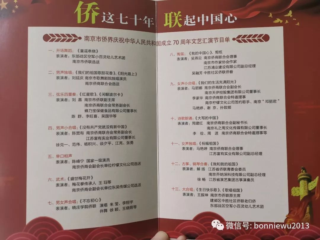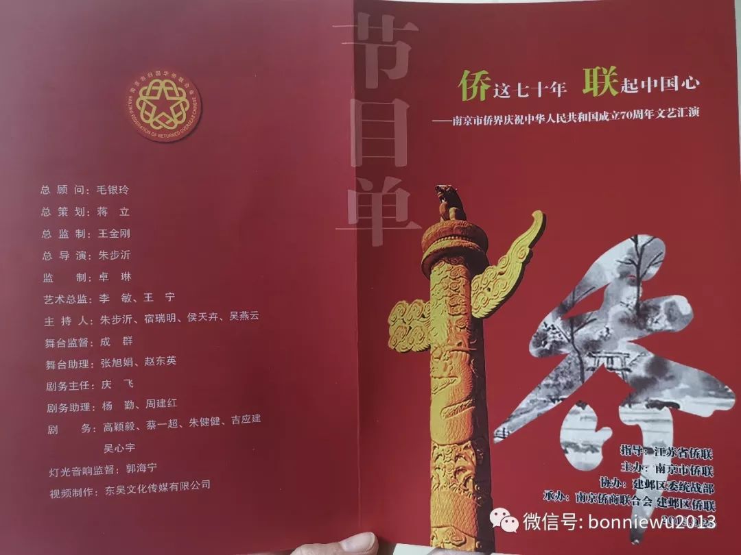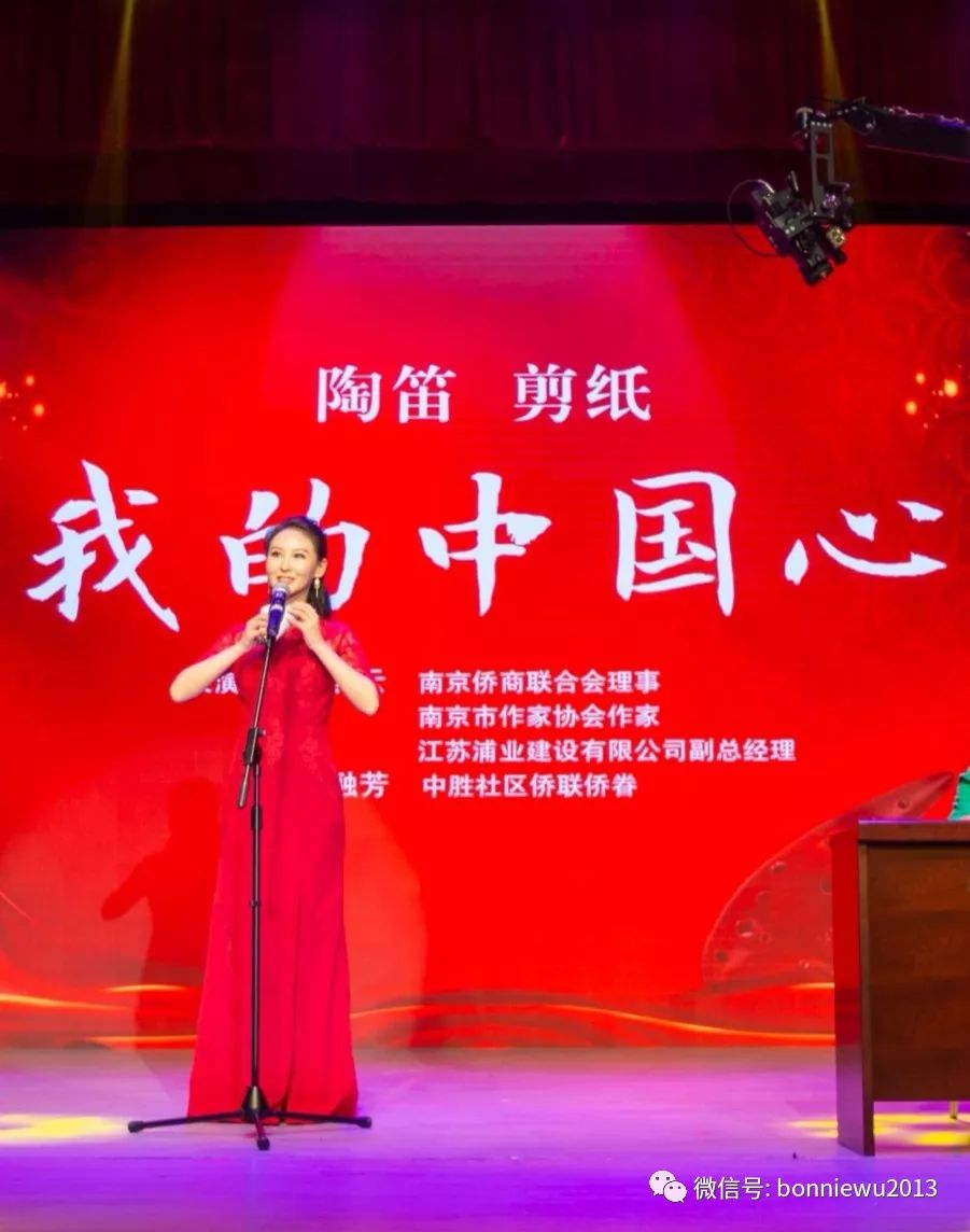 2019年的国庆,我特别荣幸不但和家人一起感受到了这次举国欢庆的快乐和荣耀,更有机会参与到南京侨界的庆典中。 9月29日,在商会和市侨联的不懈努力下,由南京市侨界代表组织的“'侨'这七十年,'联'起中国心”——南京市侨界庆祝中华人民共和国成立70周年文艺汇演圆满举行,各界领导同志和侨届人士共360余人观看了演出。而我在这次汇演中演奏陶笛,并客串了主持人,陶笛演奏前是我个人的侨心感言。能在这样的大型正式演出中以个人绵薄之力尽一份心意我万分荣幸。