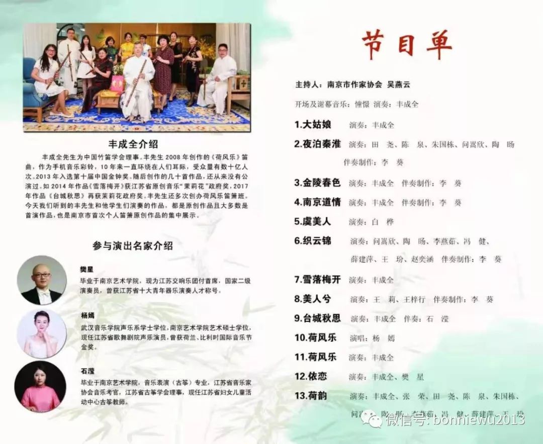 丰成全先生简介-丰成全先生为中国竹笛学会理事,丰先生2008年创作的《荷风乐》笛曲,作为手机音乐彩铃,10多年来一直环绕在人们耳际。受众不计其数,该作品2013年入选第十届中国金钟奖。随后丰先生又创作了40多首笛箫作品,其中2014年创作的《雪落梅开》,获江苏省原创音乐茉莉花政府奖。2017创作的《台城秋思》再获茉莉花政府奖。丰先生还多次创办荷风乐笛箫班。